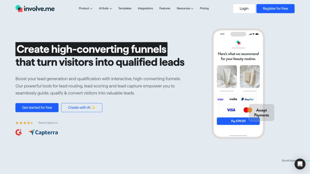 Involve.me — это no-code платформа, позволяющая бизнесу создавать интерактивный контент для генерации лидов. Интуитивно понятный drag-and-drop редактор с более чем 20 настраиваемыми элементами позволяет быстро собирать сложные формы, опросы, калькуляторы, викторины и даже платежные страницы без единой строчки кода. Платформа решает проблему низкой конверсии и оттока посетителей сайта. Динамическая персонализация, основанная на ответах пользователя, создает уникальный опыт взаимодействия, повышая вовлеченность и превращая обычных посетителей в квалифицированных лидов. Более 300 шаблонов и гибкие настройки помогают адаптировать контент под конкретные задачи на любом этапе пути клиента.