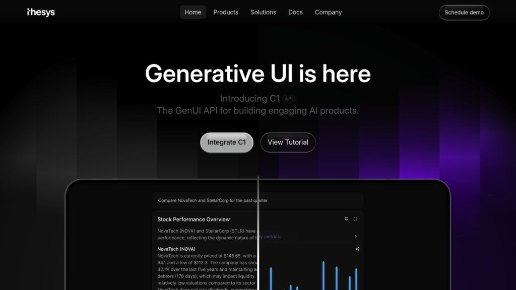 Thesys — это платформа для создания динамических пользовательских интерфейсов (UI) на базе искусственного интеллекта. Ключевой компонент, C1 API, использует большие языковые модели для генерации интерфейсов, которые мгновенно адаптируются к действиям и предпочтениям пользователя. Это превращает стандартные статичные экраны в персонализированный, постоянно развивающийся опыт взаимодействия. Платформа решает проблему создания сложных, адаптивных интерфейсов, которые ранее требовали значительных затрат времени и ресурсов на разработку. С Thesys разработчики могут создавать приложения, которые ведут себя интуитивно, предвосхищают потребности пользователя и предоставляют более глубокое вовлечение без необходимости постоянных ручных обновлений.