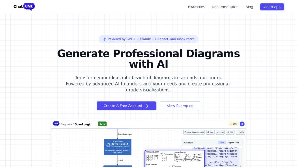 ChatUML — это ИИ-ассистент, который генерирует UML-диаграммы и архитектурные схемы из текстовых описаний. Инструмент использует естественный язык или режим кода PlantUML для быстрой визуализации идей. Сервис решает проблему трудоемкого ручного создания и обновления диаграмм. Он ускоряет процесс проектирования, улучшает понимание сложных систем и повышает точность документации, особенно в командной работе.