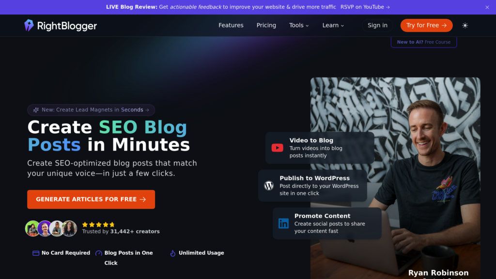RightBlogger — это комплексная ИИ-платформа, объединяющая более 40 инструментов для блогеров и создателей контента. Система использует последние достижения в области ИИ для генерации высококачественных текстов, проведения исследований ключевых слов, создания структуры статей и оптимизации контента под поисковые системы. Платформа позволяет создавать разнообразный контент — от длинных статей до коротких постов для соцсетей — с учетом заданного тона, стиля и ключевых слов. Основная задача RightBlogger — радикально ускорить процесс создания контента и повысить его качество, снимая с пользователя рутинные задачи. Инструмент решает проблему нехватки времени и идей, помогая поддерживать регулярный выпуск публикаций и улучшать видимость блога в поисковой выдаче. Благодаря интеграции с популярными CMS, такими как WordPress, Webflow и Ghost, процесс публикации становится максимально простым и интегрированным в рабочий процесс.