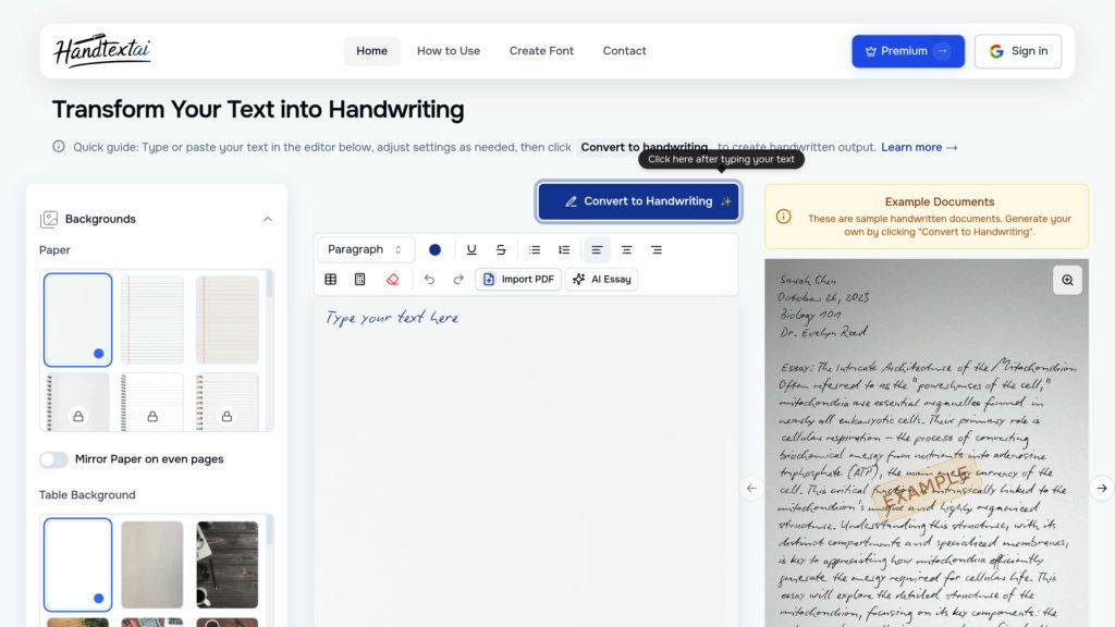 HandtextAI — это ИИ-конвертер, который переводит ваш цифровой текст в имитацию рукописного письма. Инструмент анализирует заданный текст и генерирует его в одном из более чем 80 доступных стилей почерка, добавляя реалистичные визуальные эффекты, такие как естественное затенение чернил и тени. Вы можете выбрать фон листа — в клетку, в линейку или чистый, с настраиваемой текстурой, чтобы документ выглядел максимально аутентично. Этот сервис решает задачу быстрого создания персонализированных рукописных документов. Устали от монотонного набора текста? Нужны заметки, письма или учебные материалы, выглядящие так, будто написаны от руки? HandtextAI позволяет сэкономить время и усилия, имитируя процесс ручного письма с высокой степенью детализации, что идеально подходит для образовательных целей, личной переписки или творческих проектов, где важна эстетика рукописного текста.