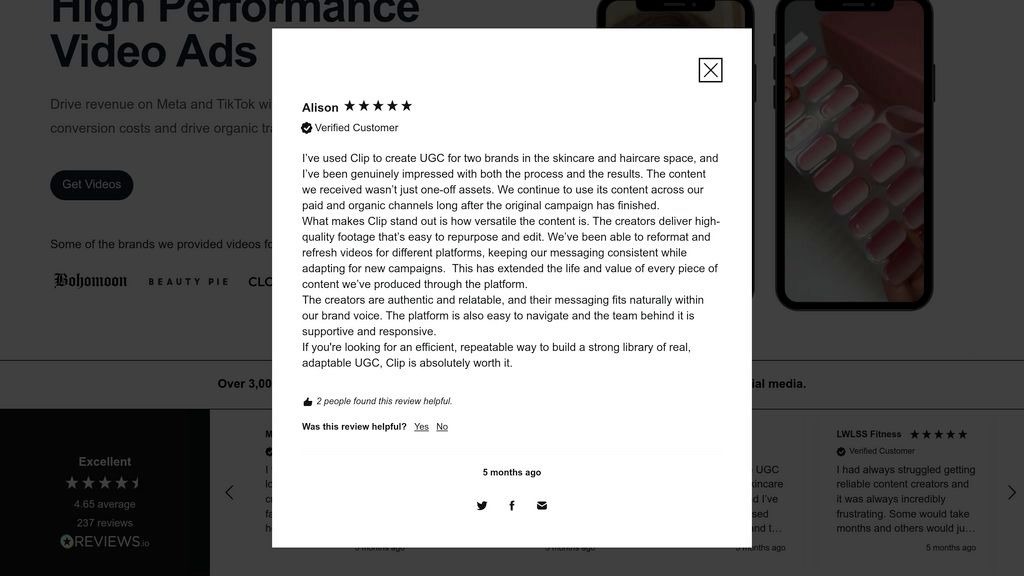 Clip — это платформа, которая соединяет бренды с видеокреаторами для создания пользовательского контента (UGC). Система автоматически подбирает авторов из тщательно отобранной базы (только 7% проходят отбор), учитывая ваши требования к демографии и стилю. Креаторы получают персональные рекомендации и обучение, чтобы поддерживать высокий стандарт качества. Платформа решает проблему долгого и дорогого производства видеоконтента, особенно для соцсетей. Вместо ручного поиска авторов, согласований и контроля, Clip автоматизирует эти процессы. Бренды получают готовые видеоролики, оптимизированные под разные форматы, в среднем за 7 дней, с полными коммерческими правами для глобального использования.