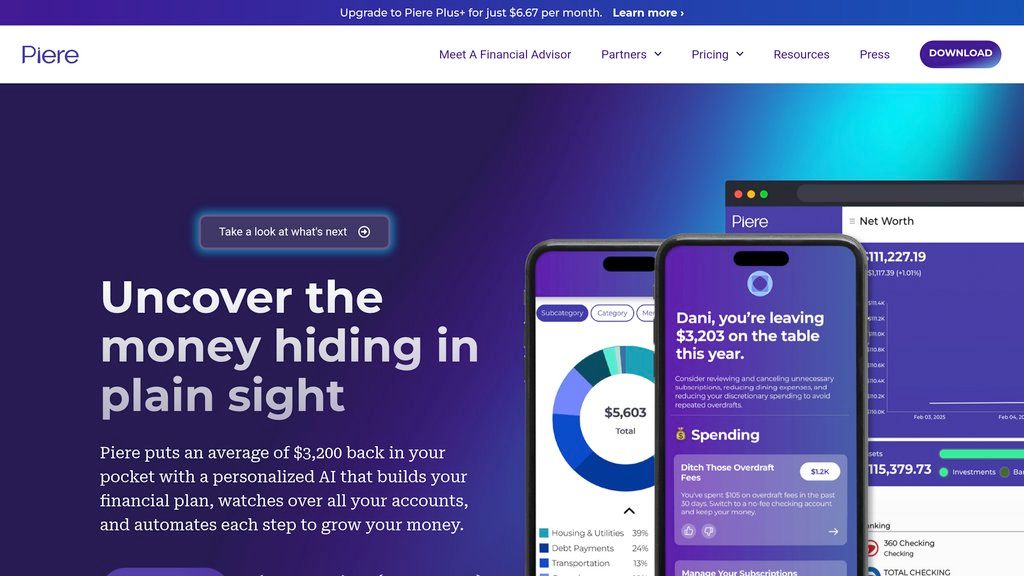 Piere — это платформа для управления личными финансами, которая агрегирует все ваши финансовые счета в едином интерфейсе. Используя исторические данные о транзакциях и заданные приоритеты, инструмент автоматически генерирует персонализированные планы расходов всего в два клика. Система непрерывно анализирует ваши финансы, предоставляя практические рекомендации и индивидуальные стратегии для роста капитала. Основная задача Piere — снять головную боль от рутинного учёта и бюджетирования. Вместо того чтобы тратить часы на сводные таблицы и ручную категоризацию, пользователи получают готовый, адаптированный под их нужды бюджет и чёткие указания по оптимизации трат и достижению финансовых целей.