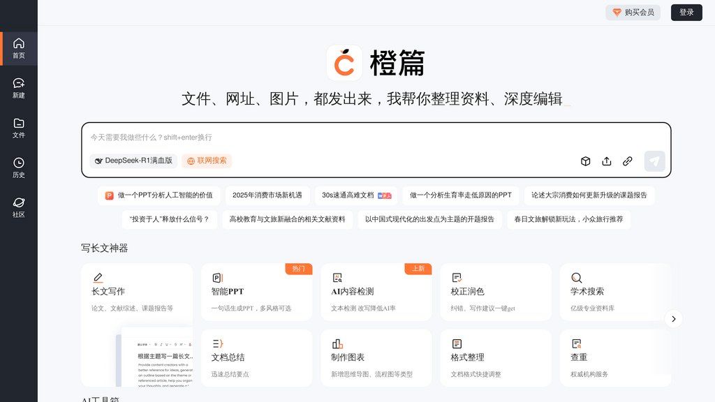 橙篇 — это комплексное решение на базе ИИ, разработанное для обработки больших объемов документов и создания контента. Используя обширную базу данных Baidu Library (1.2 млрд документов) и передовые языковые модели, инструмент позволяет анализировать файлы различных форматов, извлекать ключевую информацию, генерировать профессиональные тексты и отвечать на вопросы по содержанию. Сервис решает проблему трудоемкой обработки и анализа больших документов. Вместо ручного чтения и конспектирования, пользователи получают готовые резюме, ответы на запросы и структурированный контент, что значительно ускоряет исследовательскую, аналитическую и писательскую работу.