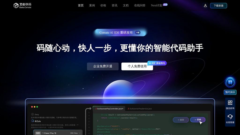 文心快码 (Baidu Comate) — это интеллектуальный помощник для разработчиков, созданный на основе большой языковой модели Wenxin. Инструмент анализирует накопленные Baidu данные по программированию и открытые исходники, чтобы предлагать персонализированные решения для написания кода. Он работает в режиме реального времени, предлагая автодополнение, генерацию кода по текстовому описанию, помощь в тестировании и оптимизации. Основная цель 文心快码 — ускорить и упростить процесс разработки, снижая рутинную нагрузку на программистов. Инструмент помогает писать более качественный и безопасный код, автоматически выявляя потенциальные уязвимости и предлагая исправления. Это высвобождает время разработчиков для решения более сложных задач и инноваций.