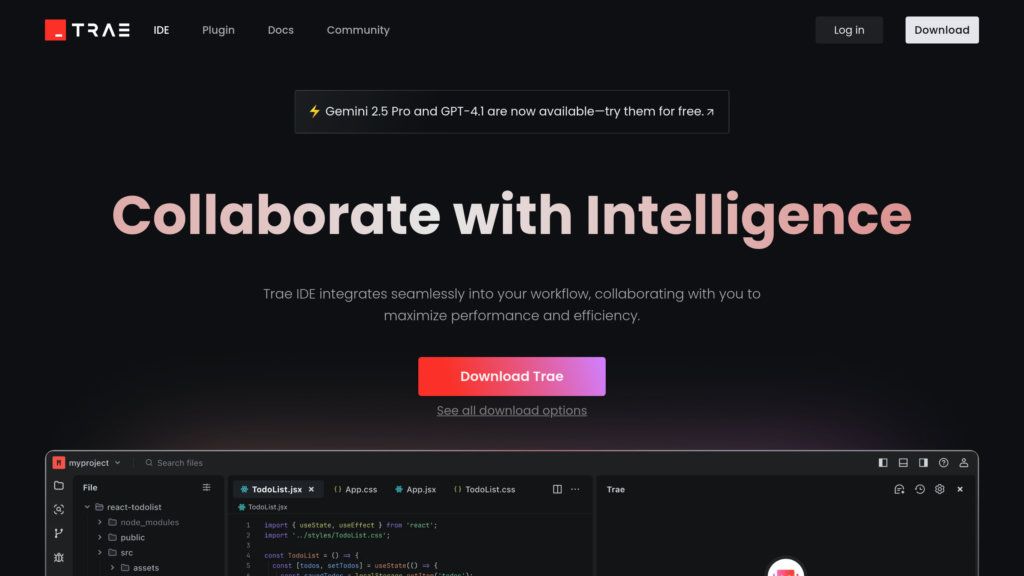 Trae – среда разработки с ИИ от ByteDance. Автоматизирует рутину, предлагает код, генерирует приложения по описанию. Для разработчиков.