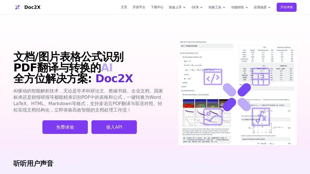 Doc2X — это платформа для интеллектуальной обработки документов, которая превращает ваши PDF-файлы и сканы в редактируемые форматы. Используя передовые модели ИИ, включая GPT и Deepseek, инструмент точно распознает текст, сложные математические и химические формулы, таблицы и изображения. Вы можете конвертировать документы в Word, LaTeX, HTML и Markdown, сохраняя исходное форматирование, что критически важно для академических статей, финансовых отчетов и учебных материалов. Основная проблема, которую решает Doc2X, — это трудоемкость и ошибки при ручном перенаборе или конвертации документов. Платформа автоматизирует этот процесс, экономя время исследователей, преподавателей и компаний. Дополнительно, встроенная функция двуязычного перевода с функцией сравнения рядом позволяет мгновенно понимать и работать с иностранными документами, делая информацию доступнее.