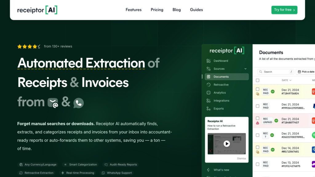 Receiptor AI извлекает чеки и счета из почты, WhatsApp, категоризирует их и интегрируется с Xero, QuickBooks. Экономит время бухгалтерам.