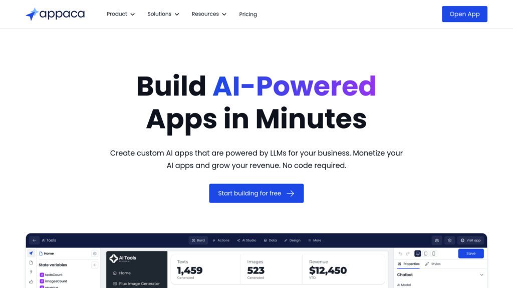 Appaca – это no-code платформа, которая дает возможность создавать AI-приложения без навыков программирования. Инструмент использует интуитивно понятный редактор с функцией drag-and-drop, встроенные базы данных и настраиваемые UI-компоненты для разработки веб-приложений, чат-ботов и внутренних инструментов на базе искусственного интеллекта. Платформа решает задачу быстрого запуска AI-продуктов для бизнеса и агентств. Вместо месяцев разработки вы получаете готовое решение, которое можно сразу монетизировать через подписки или оплату за использование AI-ресурсов. Это идеальный инструмент для предпринимателей, желающих протестировать AI-идеи или расширить свой SaaS-портфель без значительных инвестиций в разработку.