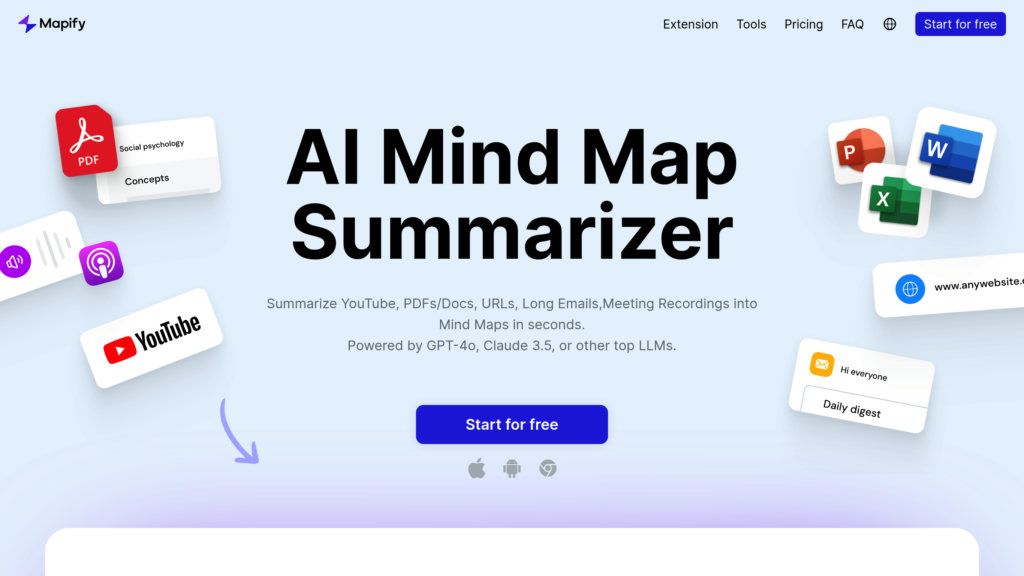 Mapify трансформирует PDF, видео, текст и аудио в интерактивные майнд-карты за секунды. Идеально для анализа и обучения.