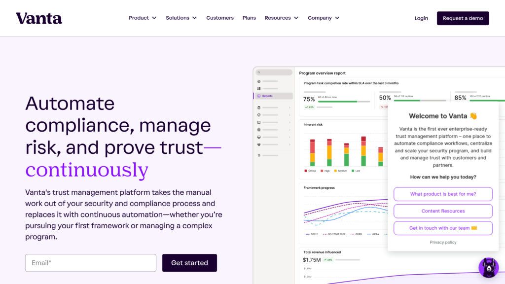 Vanta автоматизирует до 90% задач по SOC 2, ISO 27001. Постоянный мониторинг, управление рисками и ускорение аудита для B2B.