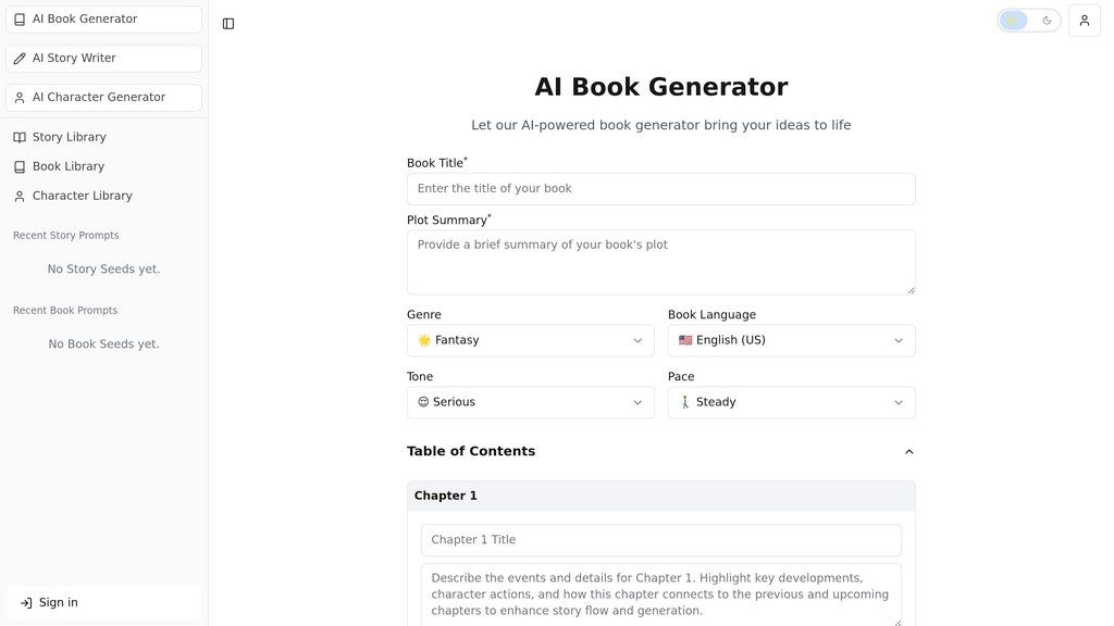 AI Book Generator – это платформа, которая автоматизирует процесс написания книг, превращая ваши идеи в готовые произведения. Вы задаете основу: название, жанр, структуру глав, желаемый тон и темп повествования. Искусственный интеллект анализирует эти параметры и генерирует текст, который вы можете дорабатывать. Сервис решает проблему «чистого листа» и нехватки времени у авторов. Он помогает преодолеть писательский блок, структурировать сюжет, улучшить стиль и ускорить публикацию, делая процесс создания книги более эффективным и доступным.