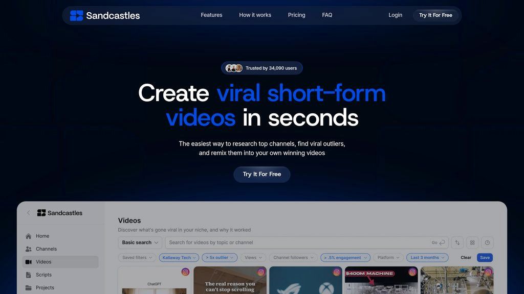 Sandcastles анализирует вирусные видео и генерирует скрипты для TikTok, Reels, Shorts. Увеличьте охваты и вовлечённость.