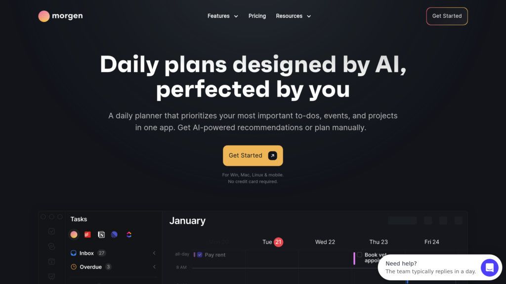 Morgen — это интегрированная платформа для управления рабочим временем, которая объединяет ваши календари, списки задач и инструменты для планирования встреч. В основе сервиса лежит ИИ-планировщик, который анализирует вашу загрузку, важность задач и личные биоритмы, предлагая оптимальное расписание на день. Вы можете предварительно просмотреть предложенный план, внести коррективы и утвердить его. Сервис решает проблему фрагментации рабочего процесса, когда информация о задачах и встречах разбросана по разным приложениям. Morgen позволяет видеть всю картину дня в едином интерфейсе, автоматически блокировать время под задачи из подключенных систем и проактивно адаптировать расписание при возникновении конфликтов или изменений, экономя ваше время и снижая стресс от перегрузки.