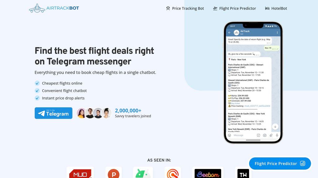 AirTrackBot — это ваш персональный ассистент для поиска авиабилетов, работающий прямо в Telegram. Используя продвинутые алгоритмы, бот сканирует сотни авиакомпаний и агентств, чтобы найти самые низкие доступные тарифы. Он анализирует текущие тренды, сезонность и популярность маршрутов для прогнозирования колебаний цен. Основная задача бота — сделать процесс поиска и бронирования авиабилетов максимально простым, быстрым и выгодным. Вам больше не нужно тратить часы на сравнение цен на разных сайтах. AirTrackBot берет всю рутину на себя, позволяя вам сосредоточиться на планировании путешествия, а не на бесконечном мониторинге цен.