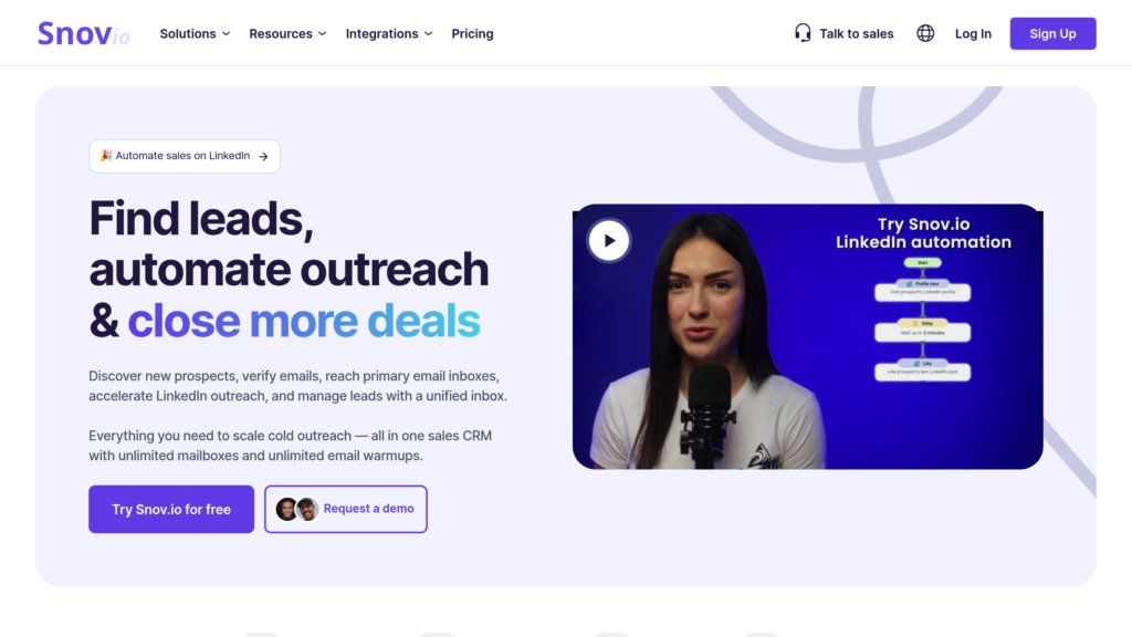 Snov.io - платформа для поиска, верификации и привлечения клиентов. Автоматизируйте email-рассылки, CRM и LinkedIn для роста продаж.