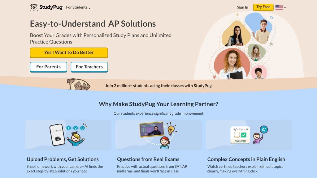 StudyPug — это интерактивная онлайн-платформа, использующая короткие, сфокусированные видеоуроки (5-15 минут) для объяснения сложных тем по математике, статистике, химии, физике и экономике. ИИ-система анализирует ответы ученика во время практики и автоматически подстраивает уровень сложности, чтобы поддерживать оптимальную зону обучения — материал не становится ни слишком легким, ни чрезмерно трудным. Это позволяет каждому ученику двигаться в своем темпе, закрепляя знания. Платформа решает проблему нехватки индивидуального внимания в традиционном образовании. Она помогает студентам быстро находить нужные темы благодаря структурированной библиотеке уроков, разделенных по учебным стандартам и главам учебников. Функция фото-распознавания позволяет мгновенно находить решения и видеоуроки по фотографиям домашних заданий, устраняя задержки в обучении, связанные с ожиданием помощи. Диагностические тесты выявляют пробелы в знаниях и предлагают персонализированный план обучения, начиная с фундаментальных тем.