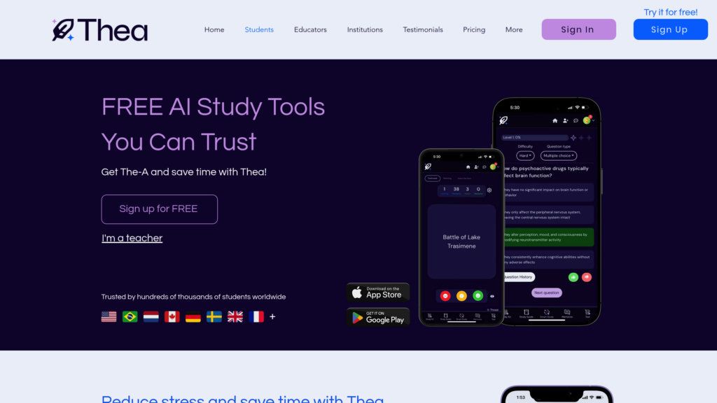 Thea Study трансформирует учебные материалы в персонализированные наборы для изучения. Создавайте карточки, тесты и резюме для глубокого понимания.