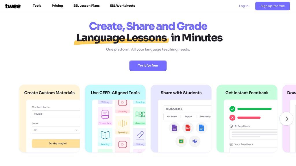 Twee — AI-платформа для преподавателей языка: генерация материалов, автоматическая проверка и управление классом. Экономия до 5 часов в неделю.