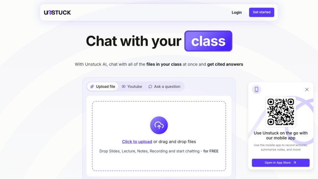 Unstuck AI превращает ваши учебные материалы (PDF, видео, тексты) в интерактивный курс. Задавайте вопросы, получайте точные ответы с цитатами.