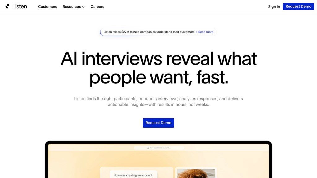 Listen Labs — это платформа, которая кардинально меняет подход к проведению качественных исследований, заменяя ручные интервью на автоматизированные сессии с AI. Система самостоятельно управляет всем процессом: от поиска и привлечения респондентов до проведения персонализированных опросов с участием AI-модератора, который адаптирует вопросы в реальном времени. После завершения интервью платформа мгновенно анализирует полученные данные. Это решение закрывает острую потребность в оперативном получении обратной связи от клиентов. Вместо того чтобы тратить недели на организацию интервью, обработку ответов и подготовку отчетов, команды получают готовые инсайты в течение нескольких часов. Это позволяет быстрее принимать продуктовые и маркетинговые решения, опираясь на реальные потребности и мнения пользователей.