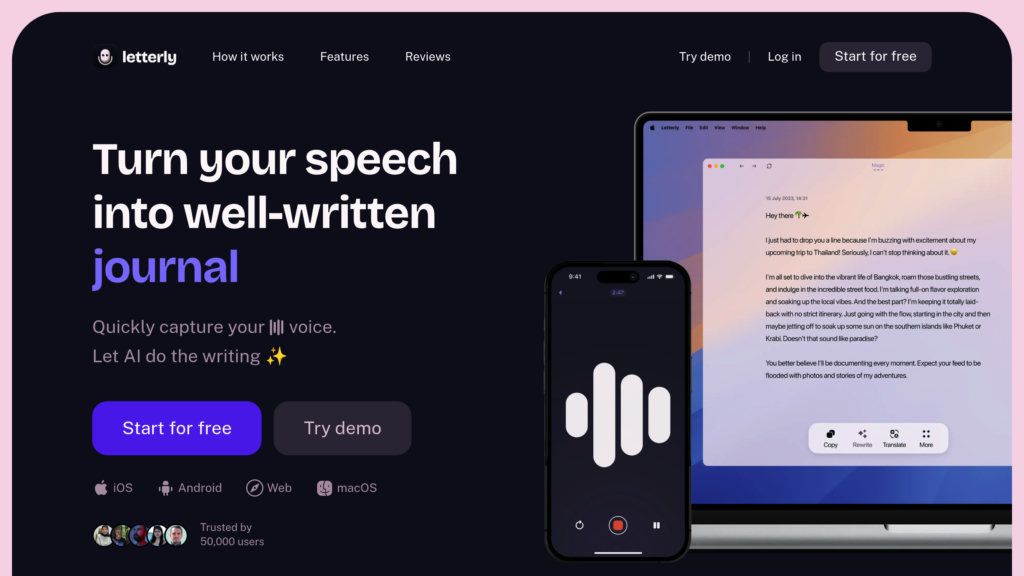 Letterly преобразует вашу речь в текст за секунды. ИИ-рерайтинг, поддержка 90+ языков, кроссплатформенность. Для занятых профессионалов.
