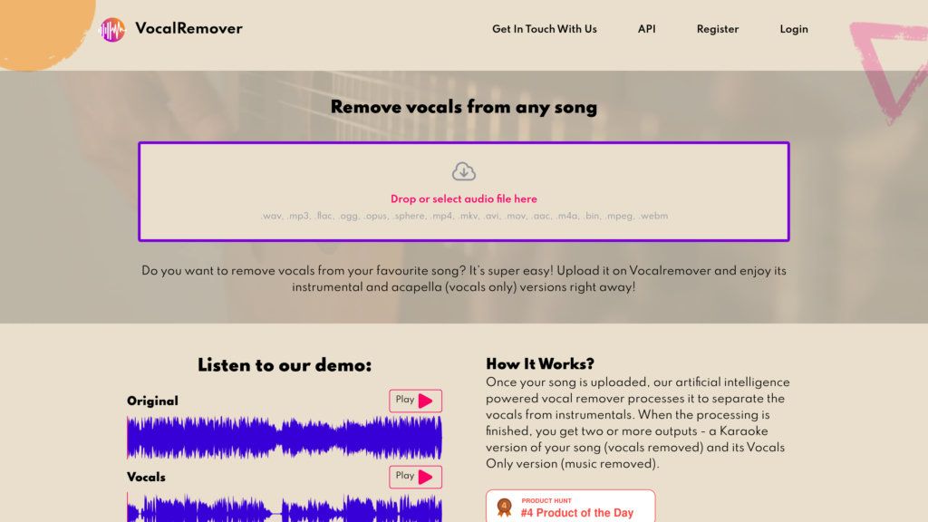 Vocal Remover использует продвинутые алгоритмы искусственного интеллекта для точного разделения вокальных партий и музыкального сопровождения в любом аудиофайле. Просто загрузите трек, и сервис за считанные секунды предоставит вам чистый инструментал для караоке или отдельно вокальную дорожку. Этот инструмент решает проблему необходимости иметь отдельные дорожки для ремиксов, караоке-версий или создания каверов. Пользователи больше не нуждаются в сложном студийном оборудовании или дорогостоящем ПО для получения качественного разделения звука.