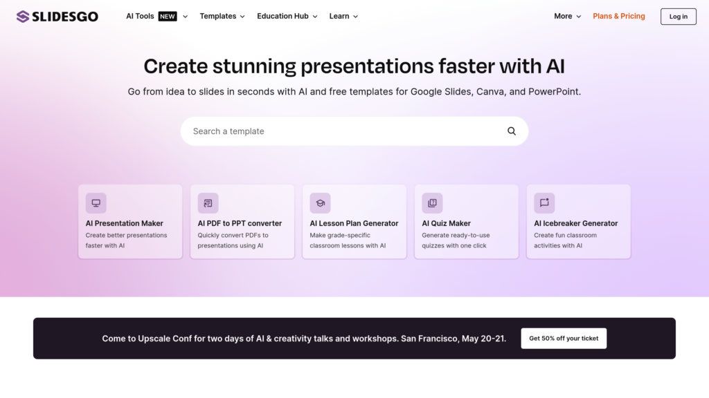 Slidesgo предлагает более 15 000 настраиваемых шаблонов для Google Slides и PowerPoint, а также AI-инструмент для быстрой генерации презентаций.