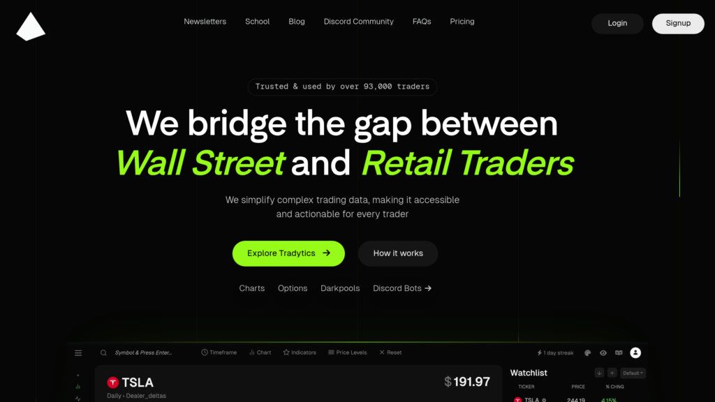 Tradytics — ИИ-платформа для розничных трейдеров. Анализирует рыночные данные, генерирует идеи для сделок по акциям, опционам и криптовалютам.
