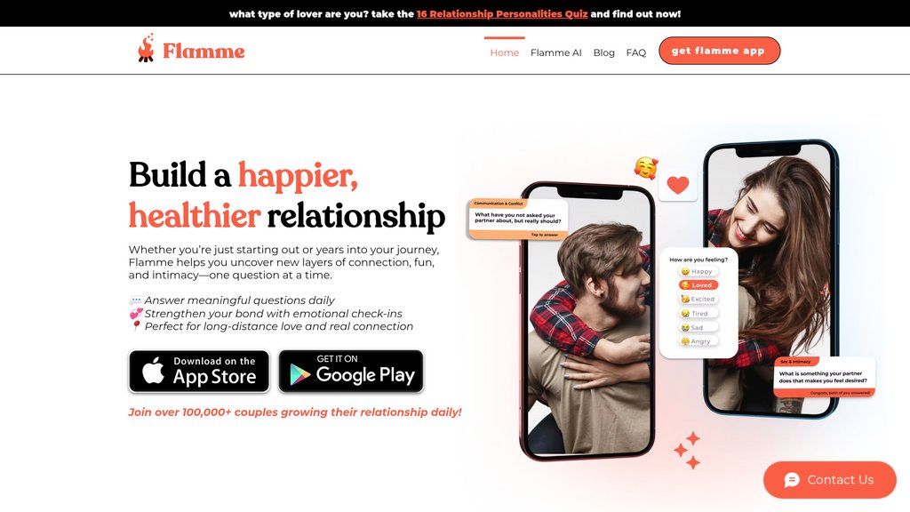 Flamme — это приложение, разработанное для пар, стремящихся сохранить и укрепить свои отношения, особенно в условиях занятости или при отношениях на расстоянии. В основе приложения лежит ИИ-коуч, который анализирует динамику ваших отношений и предоставляет персонализированные советы. Инструмент предлагает интерактивные функции, такие как ежедневные вопросы для знакомства, диагностика отношений, планирование свиданий и трекер воспоминаний, помогая парам оставаться на одной волне и развивать близость. Приложение решает распространенные проблемы пар: недостаток времени на общение, трудности в поддержании близости на расстоянии, а также помогает избежать рутины и недопонимания. Flamme предоставляет структурированные инструменты для улучшения коммуникации, планирования совместного досуга и сохранения ценных моментов, способствуя построению более счастливых и крепких отношений.
