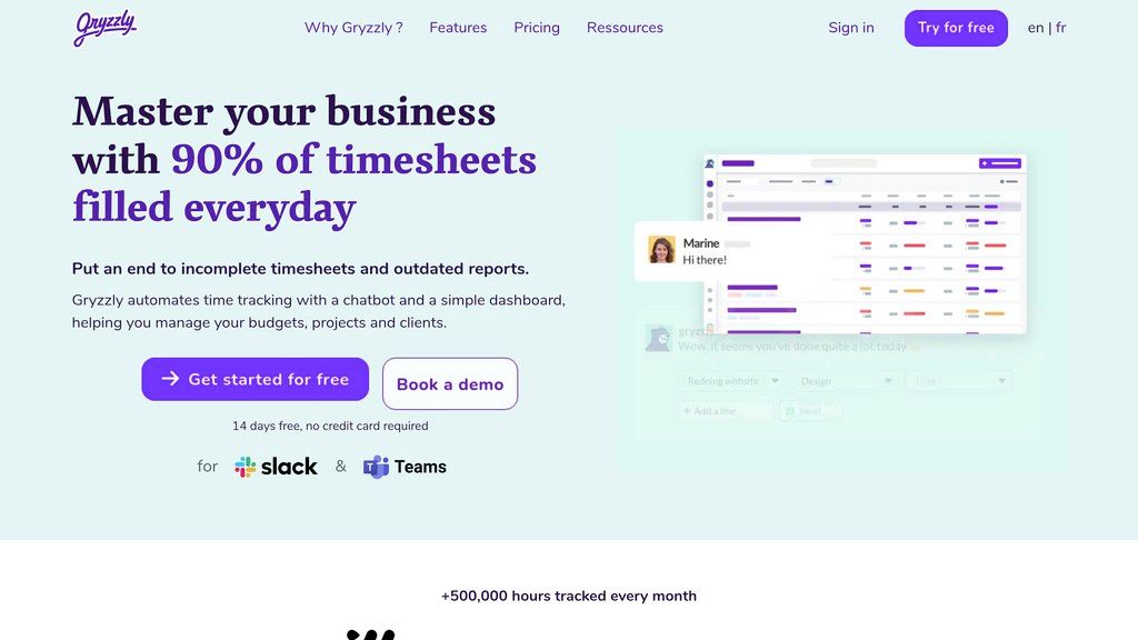 Gryzzly — ИИ-решение для автоматического учета времени через Slack/Teams. Контроль бюджетов, рентабельности и производительности команды.