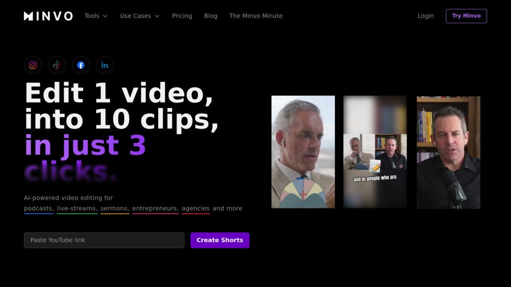 Автоматически нарезайте длинные видео на яркие шортс с AI-редактором Minvo. Добавляйте субтитры, репостите в соцсети.