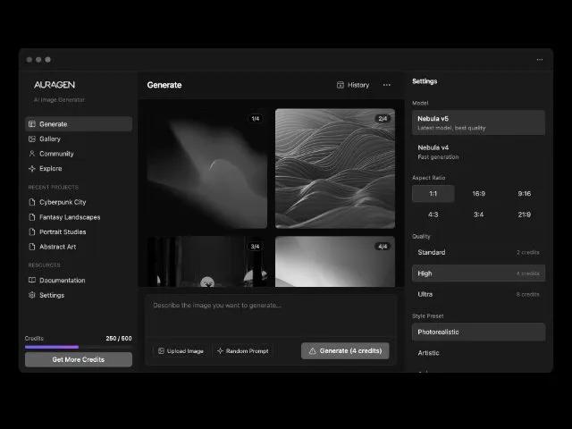 Шаблон дашборда для генератора AI-изображений. Полностраничный макет с Tailwind CSS, включает навигацию, настройки, ввод промпта и сетку изображений. Адаптивный дизайн.