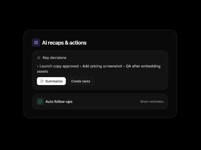 Карточка с AI-саммари и действиями в темной теме. UI-компонент для дашбордов, показывает итоги встреч, задачи и кнопки. Tailwind CSS, адаптивный дизайн.