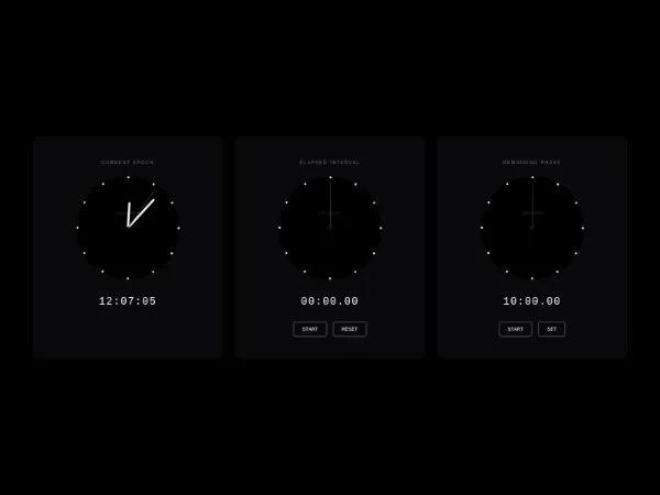 Панель времени: аналоговые часы, секундомер, таймер. Анимированные элементы, цифровые показания, кнопки управления. Для дашбордов, трекинга времени.