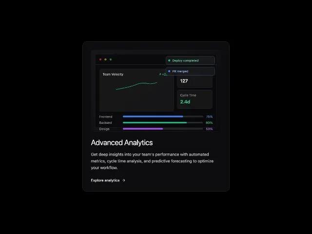 <p class="text-zinc-300 text-base leading-relaxed font-sans">Get deep insights into your team's performance with automated metrics, cycle time analysis, and predictive forecasting to optimize your workflow.</p>