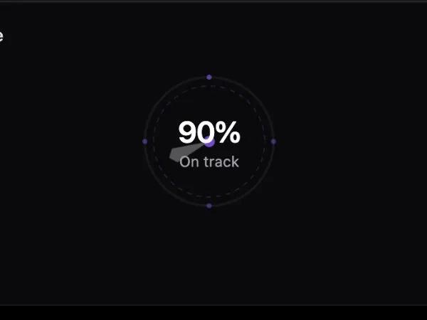 Анимированная карточка прогресса со спидометром-компасом. Отображает процент выполнения, статус и метрики. Идеально для дашбордов аналитики.