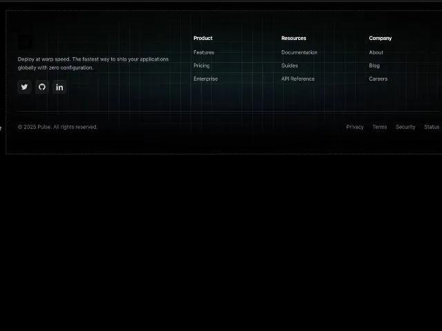 Анимированный темный футер Tailwind CSS: лого, ссылки, соцсети, градиент. Адаптивный, для SaaS, лендингов, портфолио.