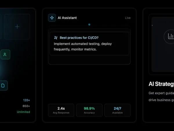 Анимированная сетка карточек с Tailwind CSS. Демонстрирует 3 фичи: интеграции, AI-ассистент, график. Идеально для SaaS-дашбордов.