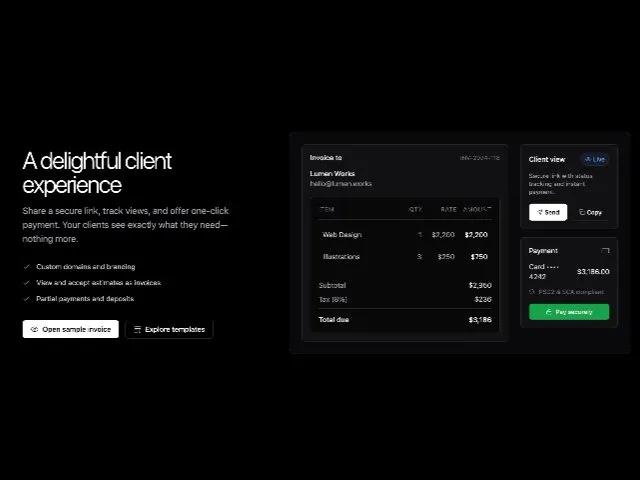Share a secure link, track views, and offer one-click payment. Your clients see exactly what they need—nothing more.