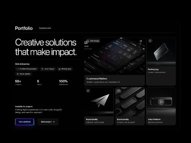 Адаптивный раздел портфолио с галереей проектов, анимациями и CTA. Идеально для лендингов, чтобы показать креативные работы. Tailwind CSS.