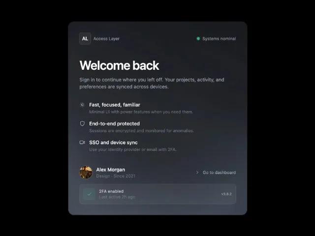 Анимированная карточка приветствия для дашборда. Tailwind UI компонент с брендингом, статусом, списком фич и профилем. Идеально для экранов входа.