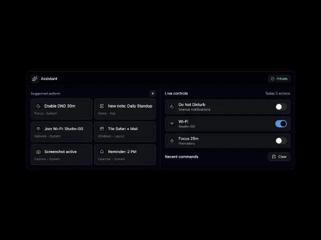 Панель управления AI-ассистента: кнопки действий, переключатели (DND, Wi-Fi), список команд. Идеально для дашбордов, виджетов.