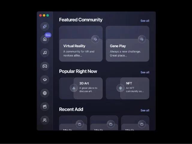 Адаптивный макет дашборда с боковой панелью иконок. Отображает карточки сообщества: популярные, недавние. Идеален для соцсетей и контент-приложений.