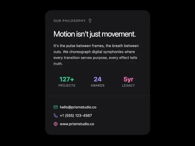 Карточка компании с разделом философии, статистикой и контактами. Идеальна для страниц 'О нас' и 'Контакты'.