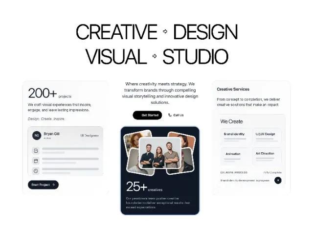 Адаптивный Hero-блок для лендингов креативных агентств. Анимация, сетка карточек с проектами, командой и услугами. CTA. Tailwind CSS.