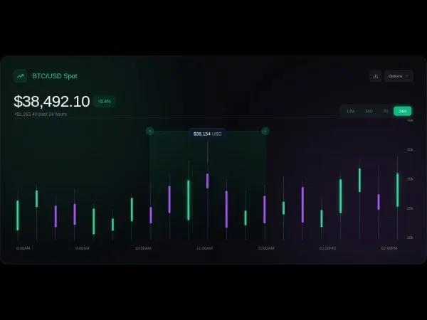 Карточка с крипто свечным графиком BTC/USD в темной теме. Анимация, фильтры, статистика. Для дашбордов, финансов.