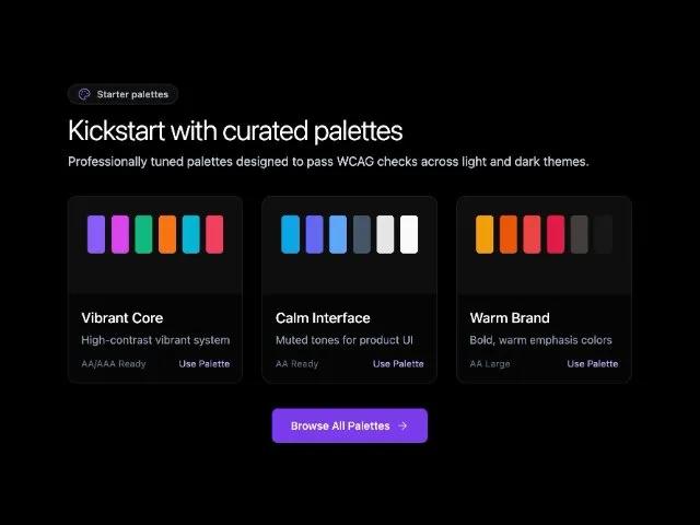 <p class="text-base text-slate-300 max-w-2xl font-geist">Professionally tuned palettes designed to pass WCAG checks across light and dark themes.</p>