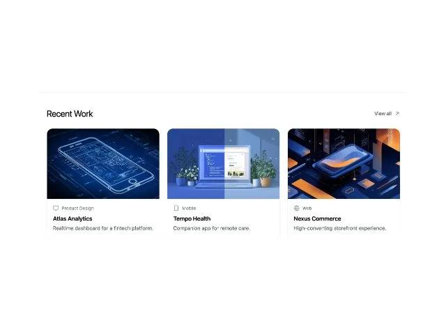 Адаптивная сетка портфолио из 3 карточек с эффектом зума при наведении. Отображает недавние работы для сайта-портфолио. Tailwind CSS.