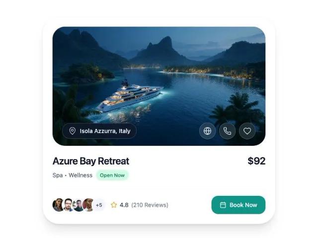 Карточка объекта недвижимости с оверлей-изображением и кнопками действий. Идеально для туристических сайтов, отелей, маркетплейсов. Адаптивная, интерактивная.